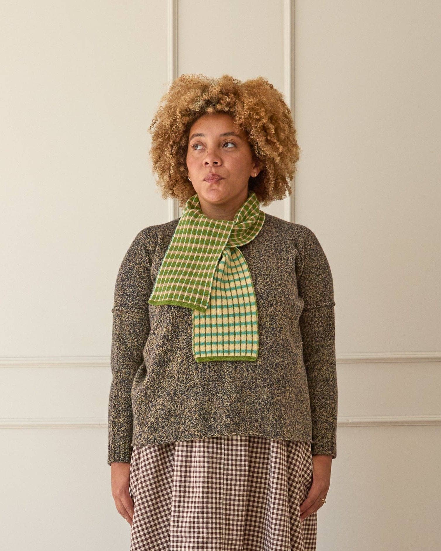 Rove's soft, woollen scarf features a captivating pattern inspired by traditional Japanese mending stitches. The process known as 'Boro' was historically used to extend the lifespan of clothing and textiles. This colour way features, Zingy Matcha Green, Pale Yellow, Fawn and Catkin. The scarf's reversible design showcases the inverse colours on the other side, providing you with two unique looks in one. Crafted with care, this neat little scarf boasts a double thickness knit, ensuring exceptional warmth whilst still small enough to fit under your collar. It's the perfect companion for braving the elements. Its timeless appeal and unisex design make it a must-have accessory for anyone seeking a blend of fashion and functionality.