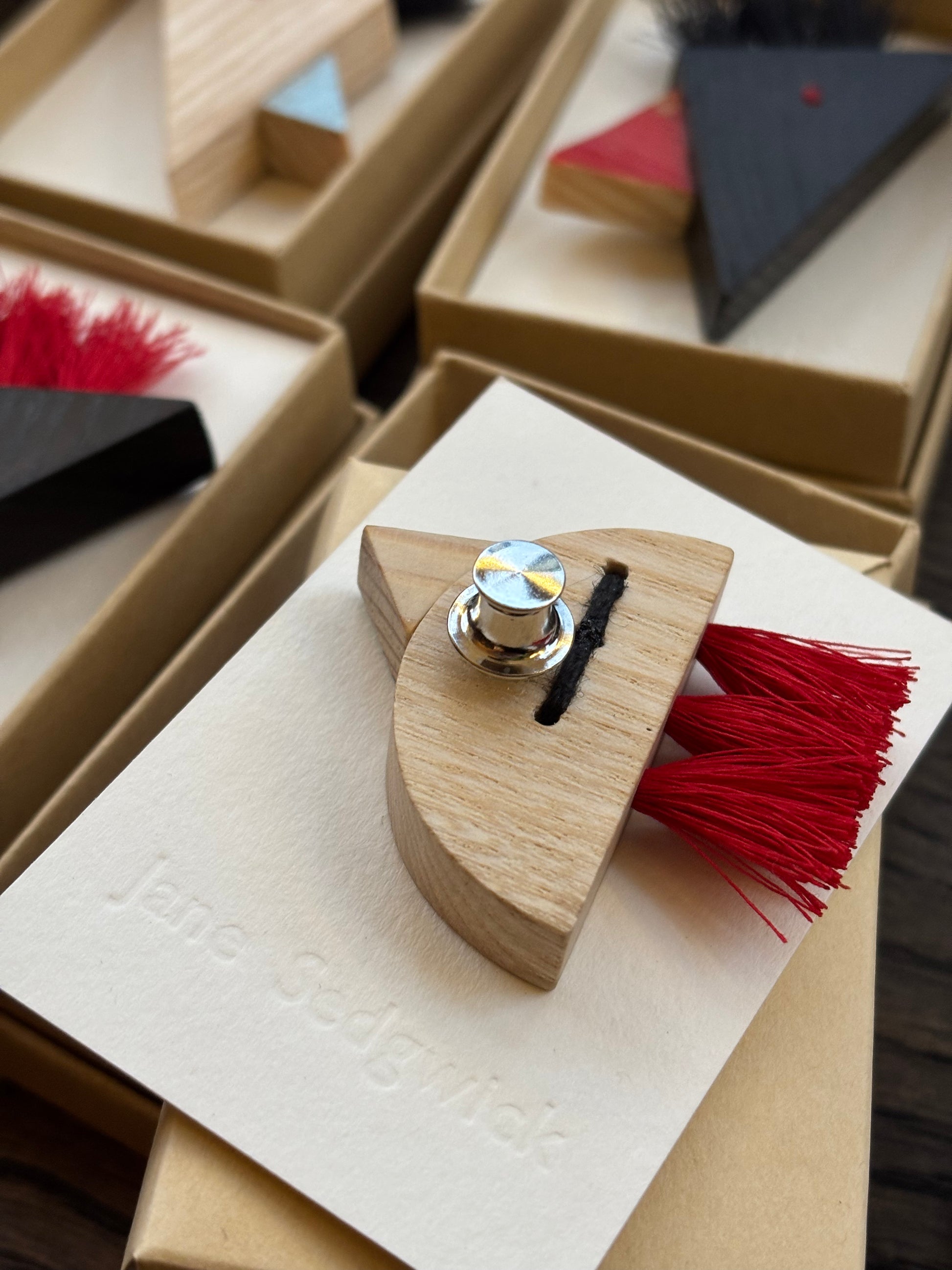 Jane Sedgwick handcrafts colourful, geometric wooden jewellery in a studio near the North Norfolk Coast. Inspired by classic educational toys and nautical themes, the artist utilises traditional woodworking methods and manages her own sustainable supply of sycamore. The Royal College of Art graduate taught in higher education for 13 years before moving to Norfolk to focus on her art and manage a woodland.