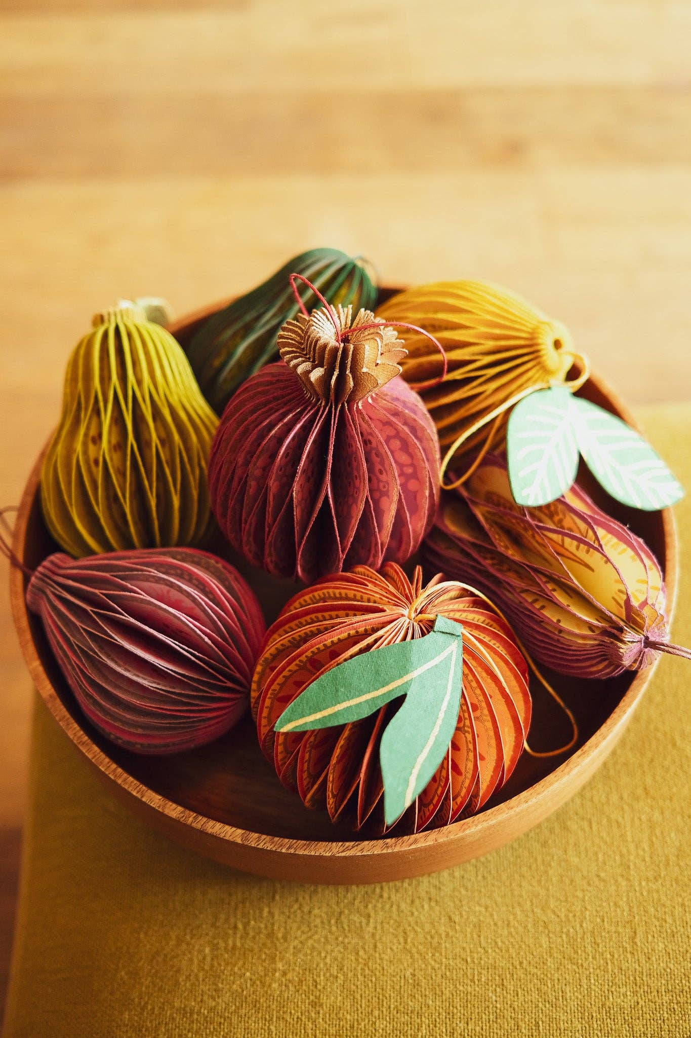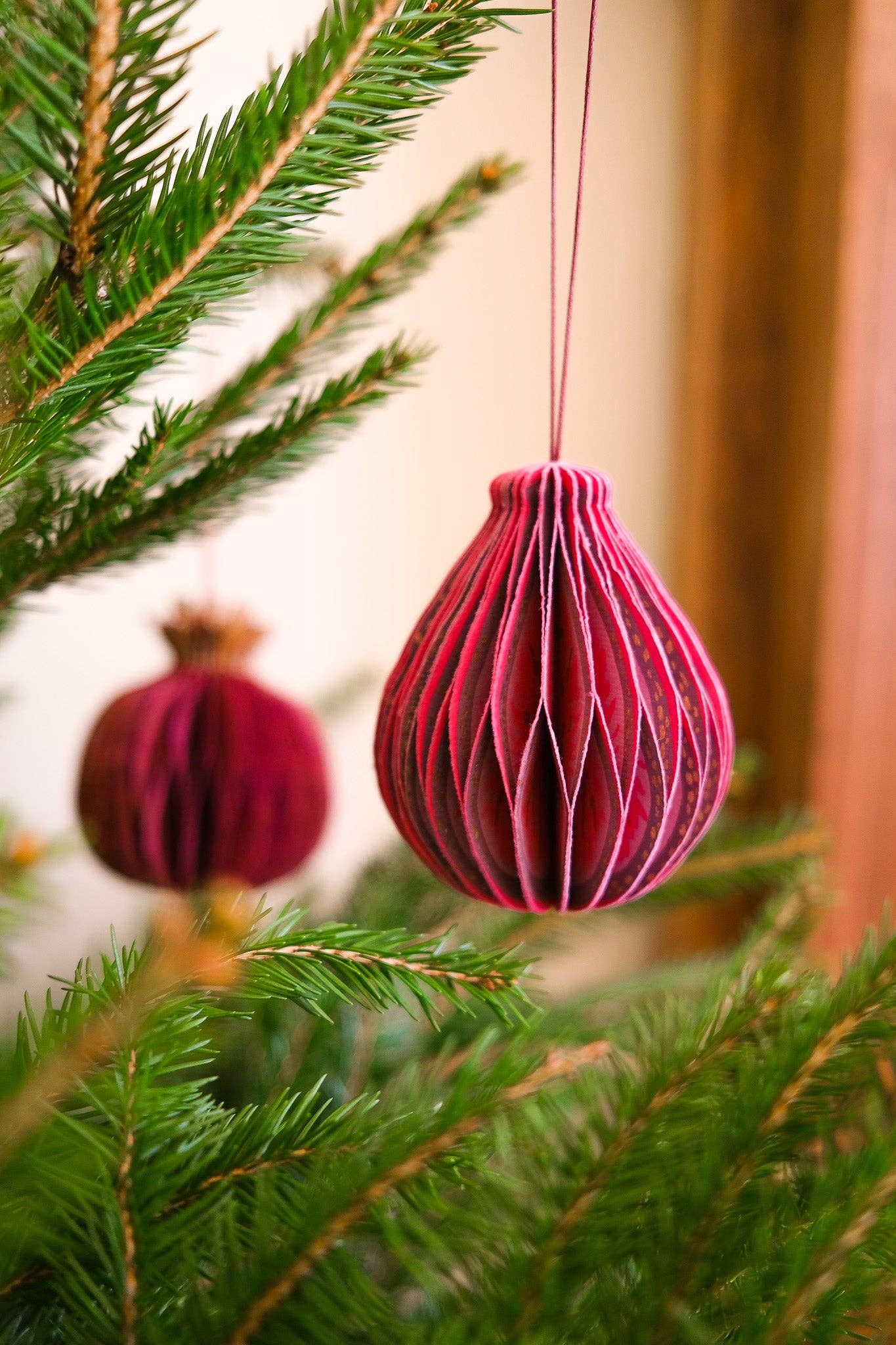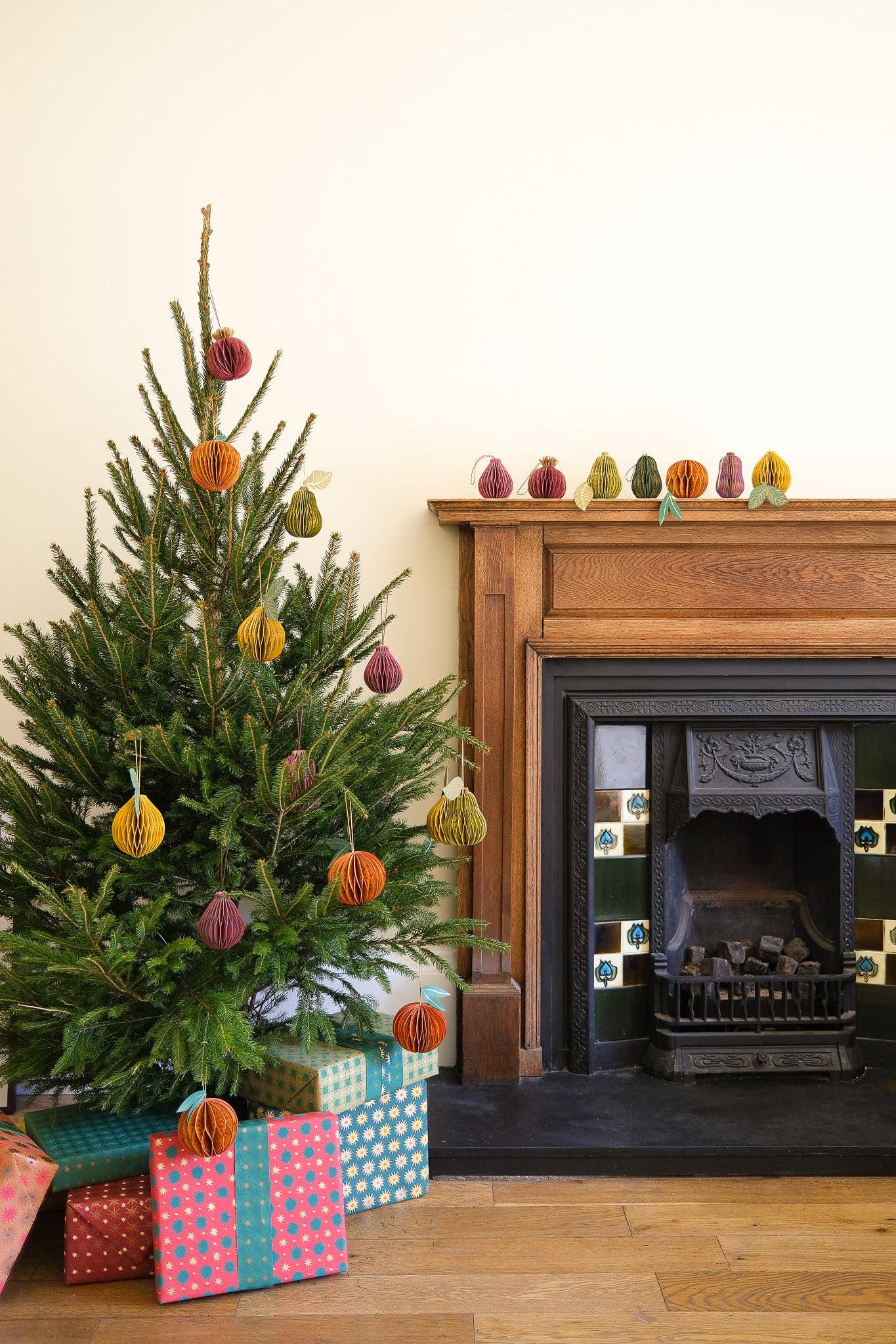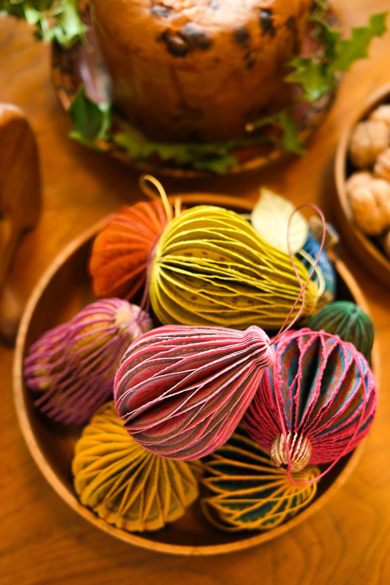 Composed of intricate layers of recycled cotton paper, each decoration unfolds to reveal a three-dimensional fig honeycomb.