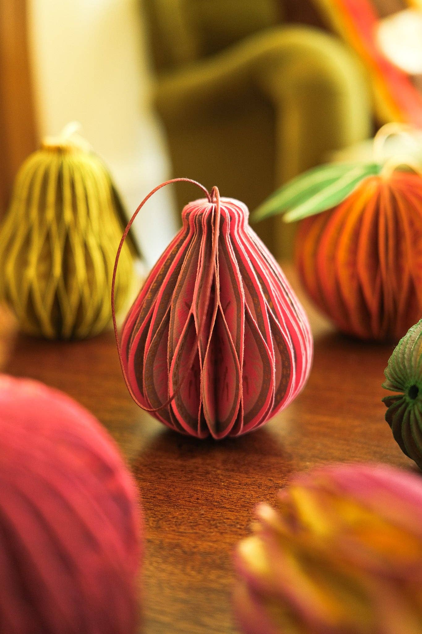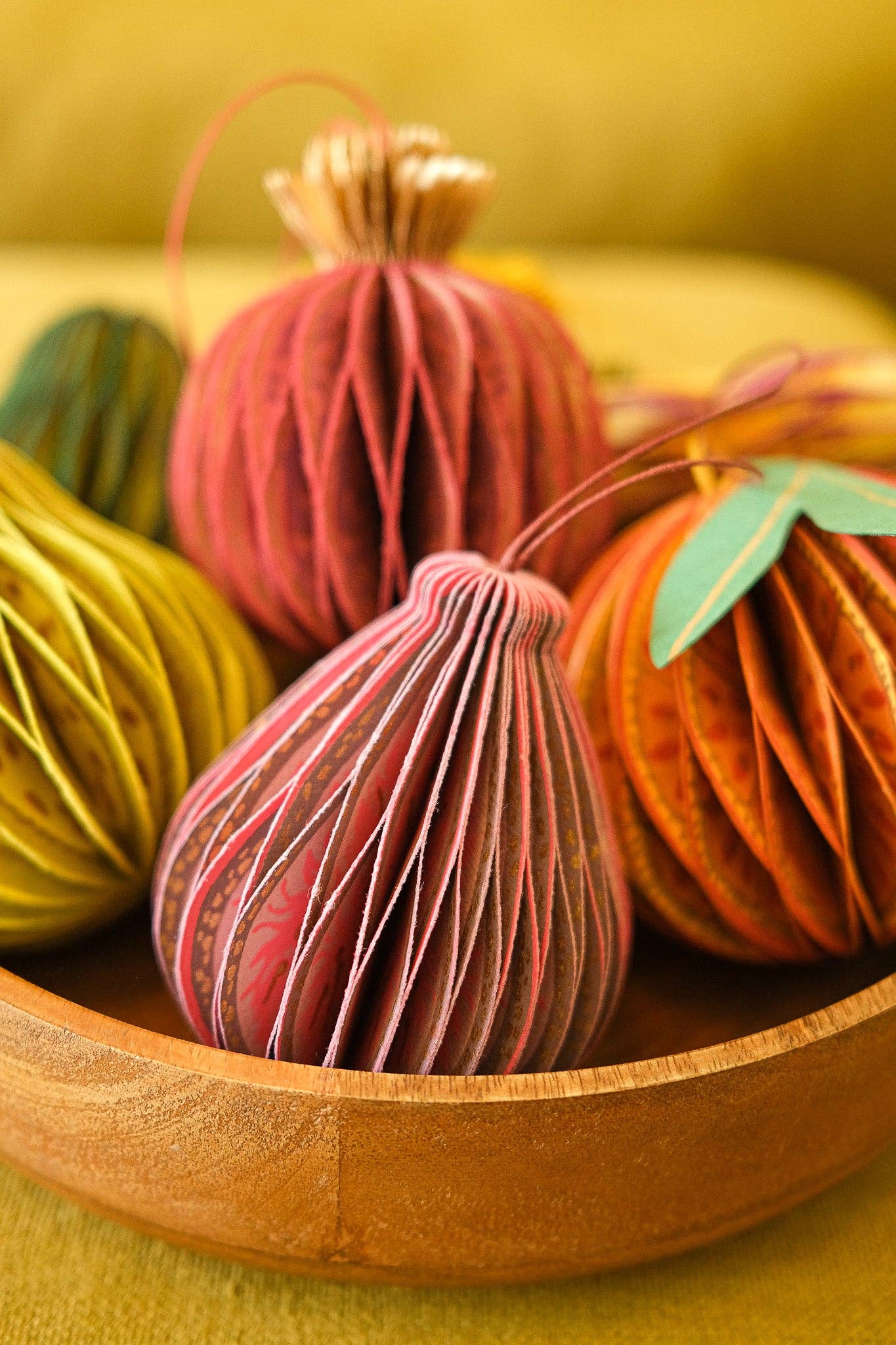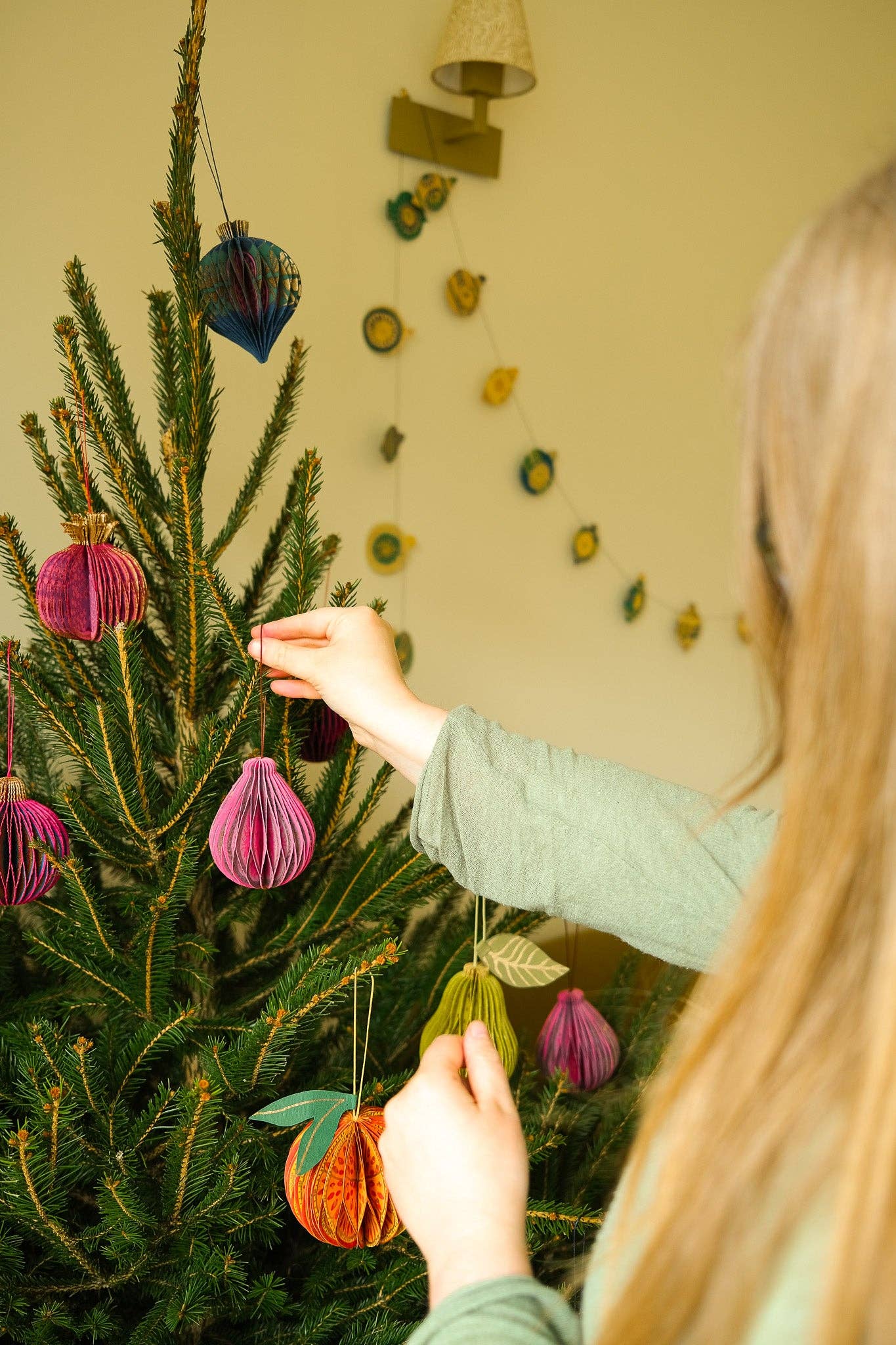 - One fig-shaped paper ornament with a cotton hanging loop - Each secured with a magnet - Screen printed by hand by talented artisans in Jaipur - Sustainably made from recycled materials