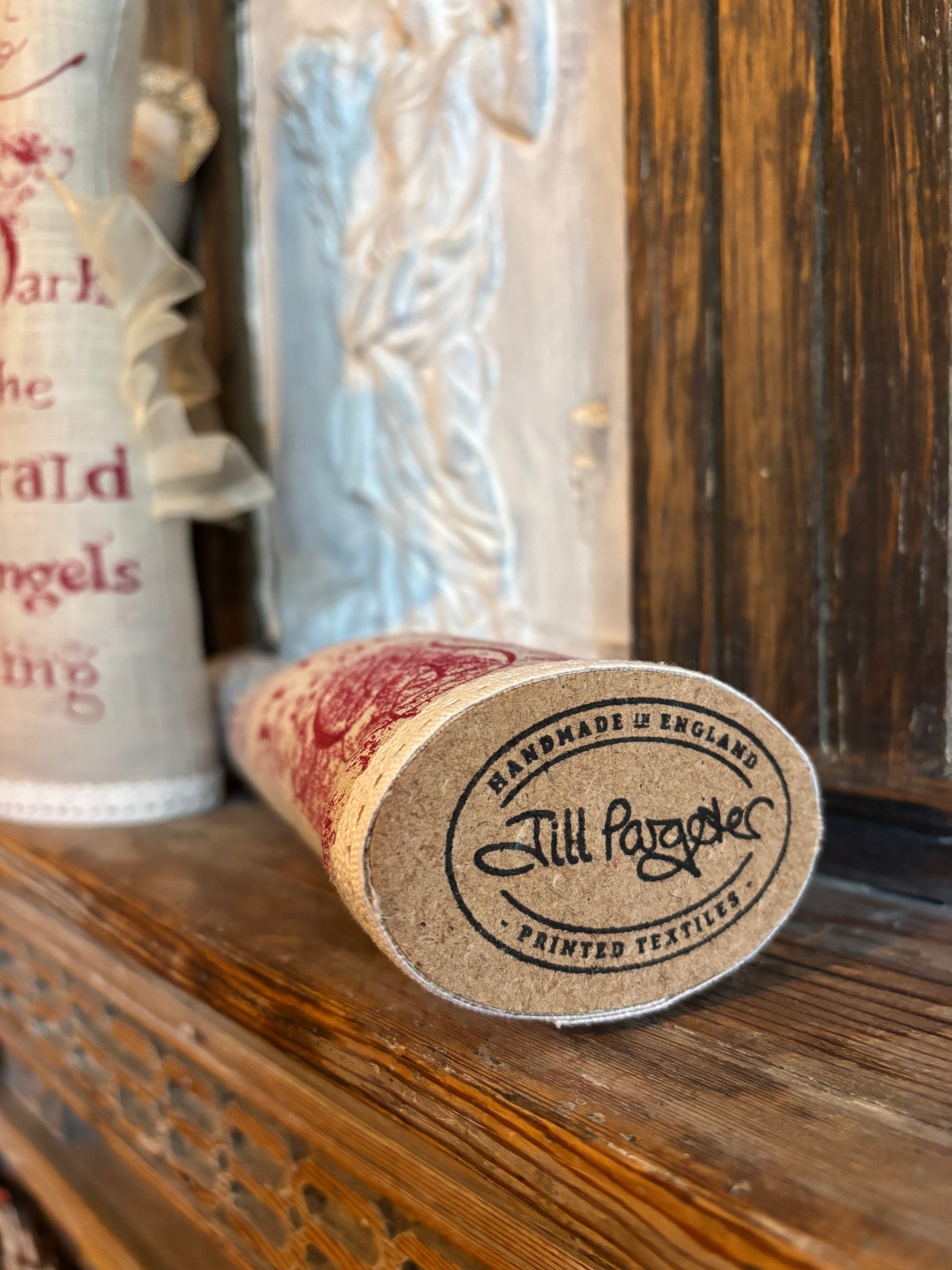 These joyous standing figures are made from hand printed pure linen and filled with wadding and seasonal spices. The figure is free standing with a wooden base and is hand sewn and trimmed with lace.