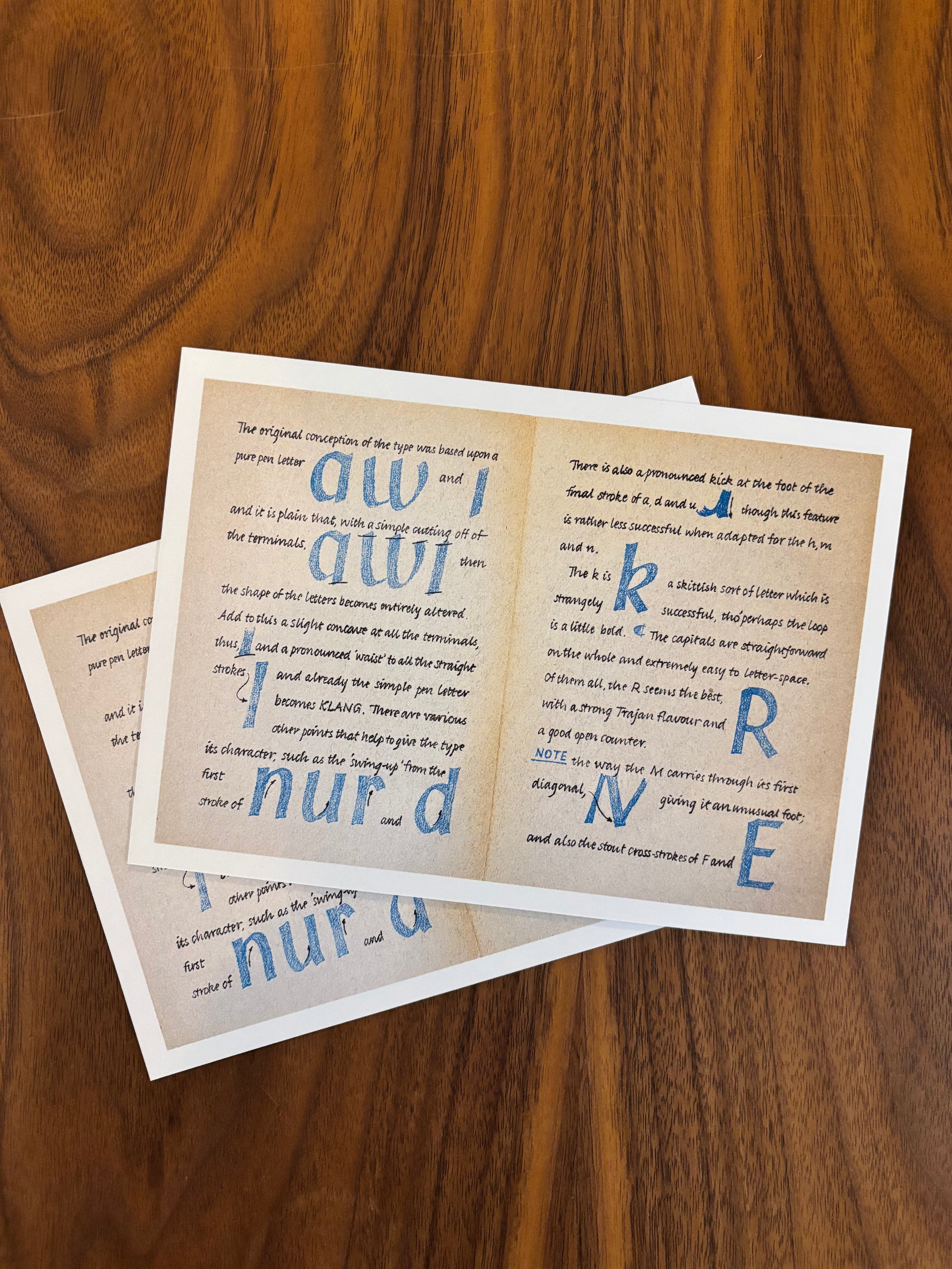 Postcard of "The Evolution of Klang" (1957) by Will Carter. From the David Parr House exhibition Goudy, Kelmscott Troy & Klang (2 August 2024 - 7 September 2024).