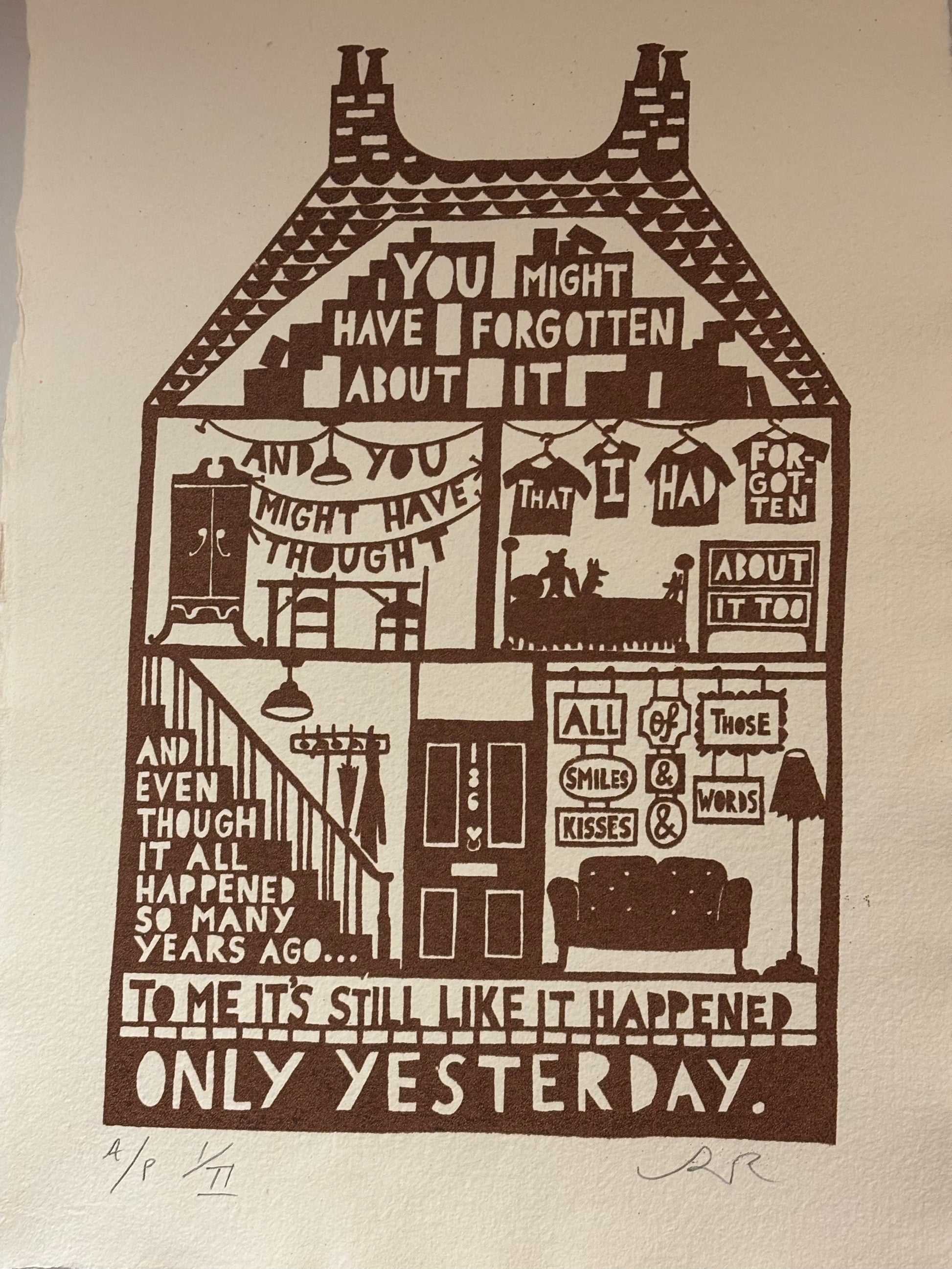 The Limited Edition Screenprint by Rob Ryan titled "Only Yesterday" is inspired by 186 Gwydir Street, the historic home of art-workman David Parr and his family. Printed in a chocolate brown on handmade Indian Khadi cotton paper with a deckle edge.