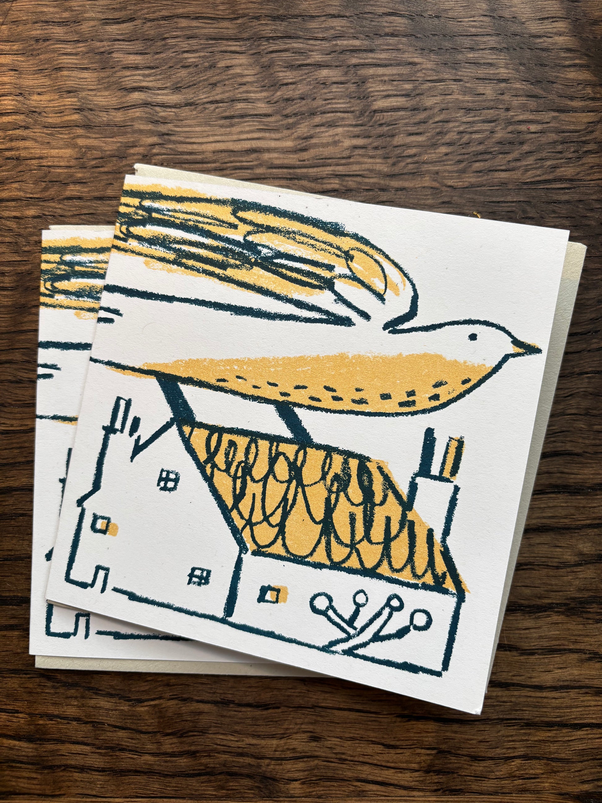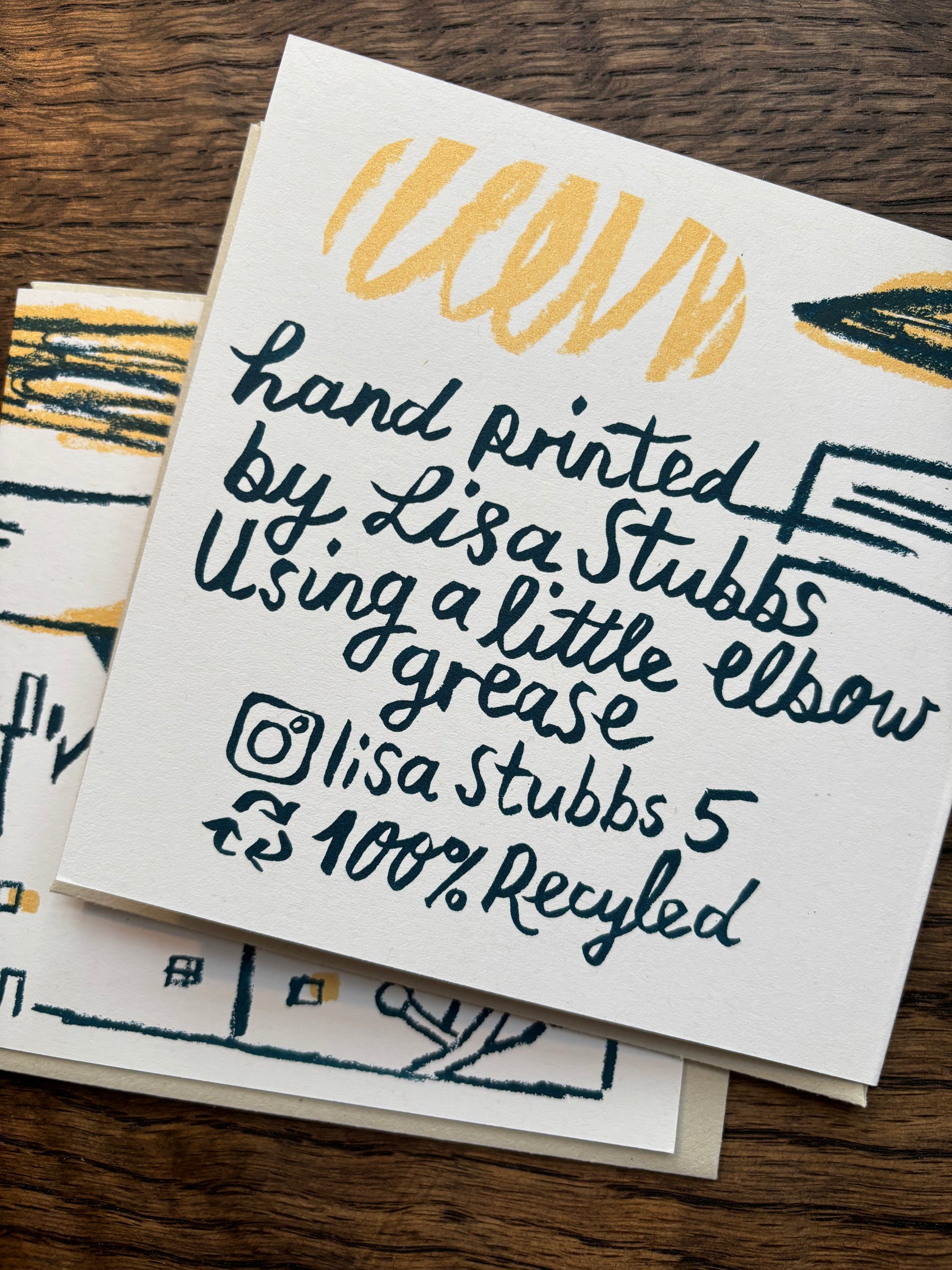 Handprinted with quality acrylic on 100% recycled card using a squeegee and a little elbow grease.