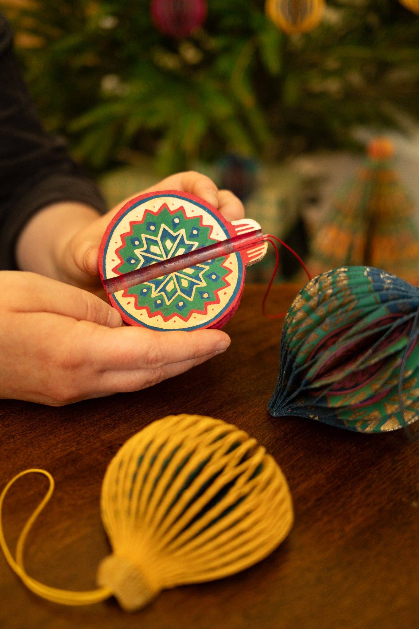 Composed of intricate layers of recycled cotton paper, each decoration unfolds to reveal a three-dimensional bauble honeycomb.