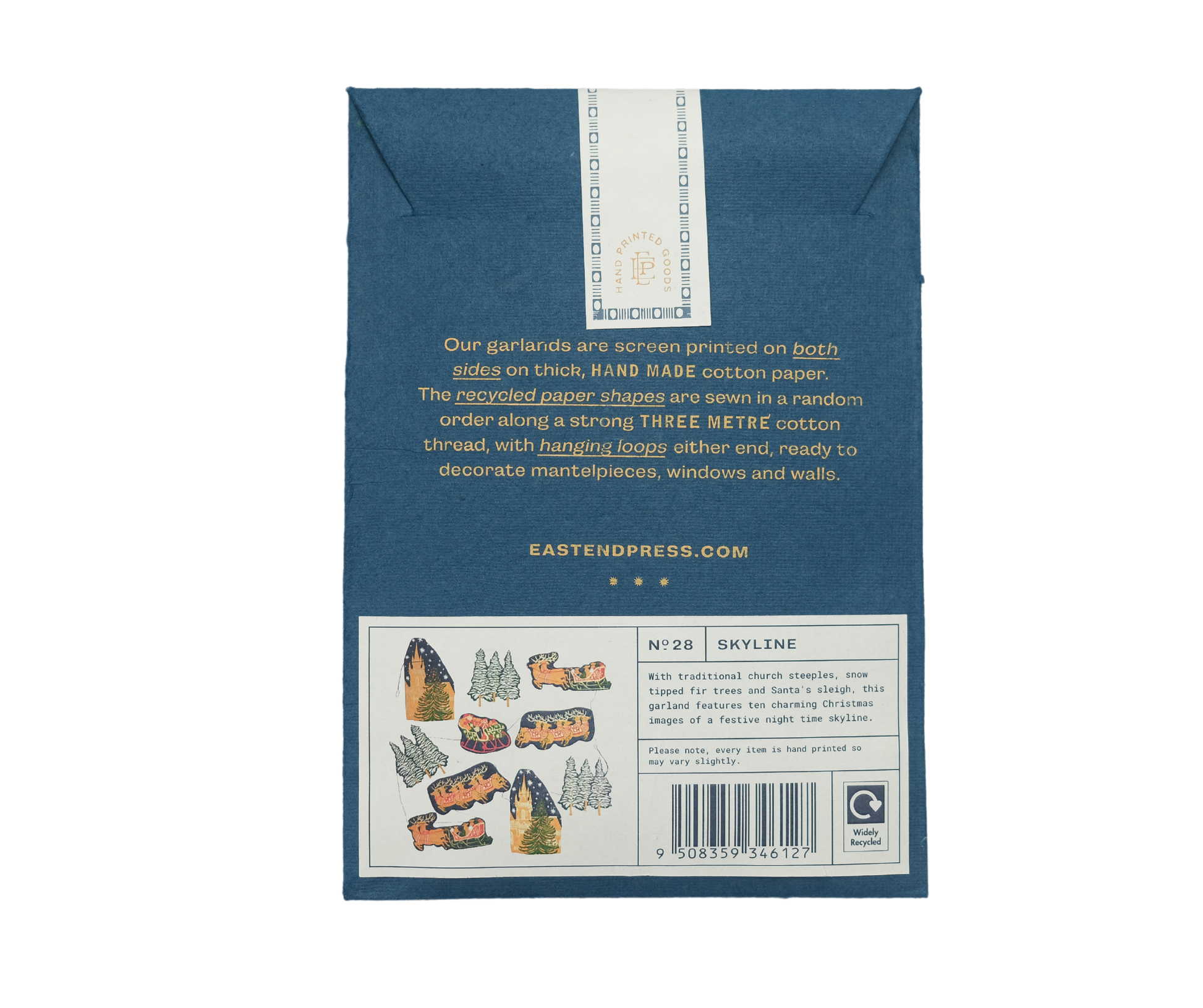 With traditional church steeples, snow tipped fir trees and Santa's sleigh, this garland features ten charming Christmas images of a festive night time skyline.